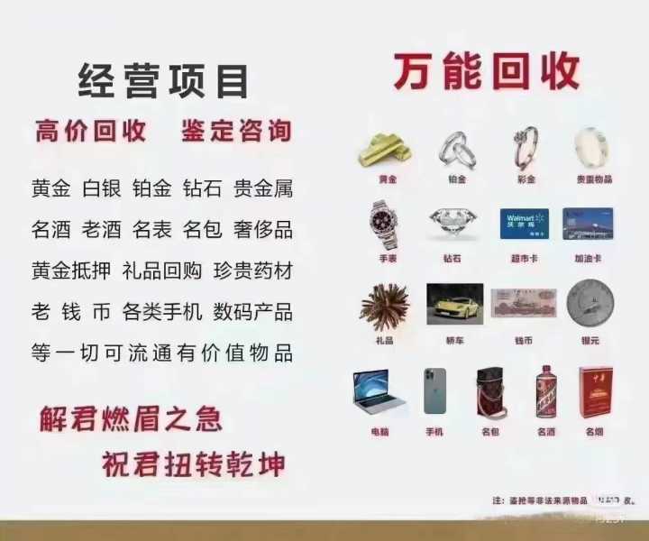 高价回收黄金钻石银元老钱币老物件茅台酒名表名包等一切有价值的闲置物品