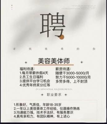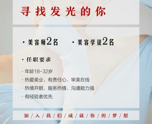 招聘岗位: 1美容师/手法熟练,善于交流,乐观积极、2美容师学员/认真负责,有上进心。长期期待你的加入…联系☎️:18132309966